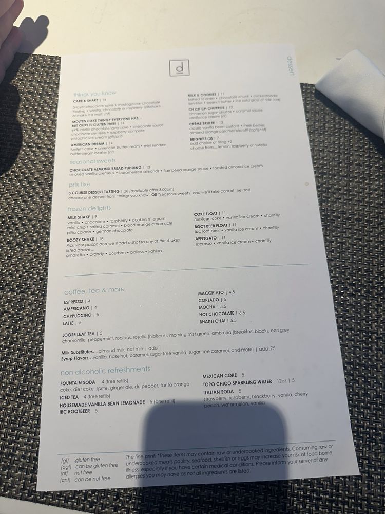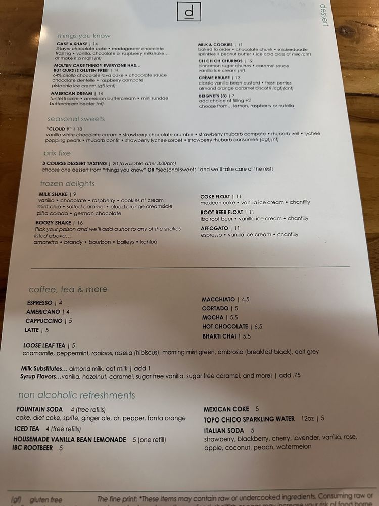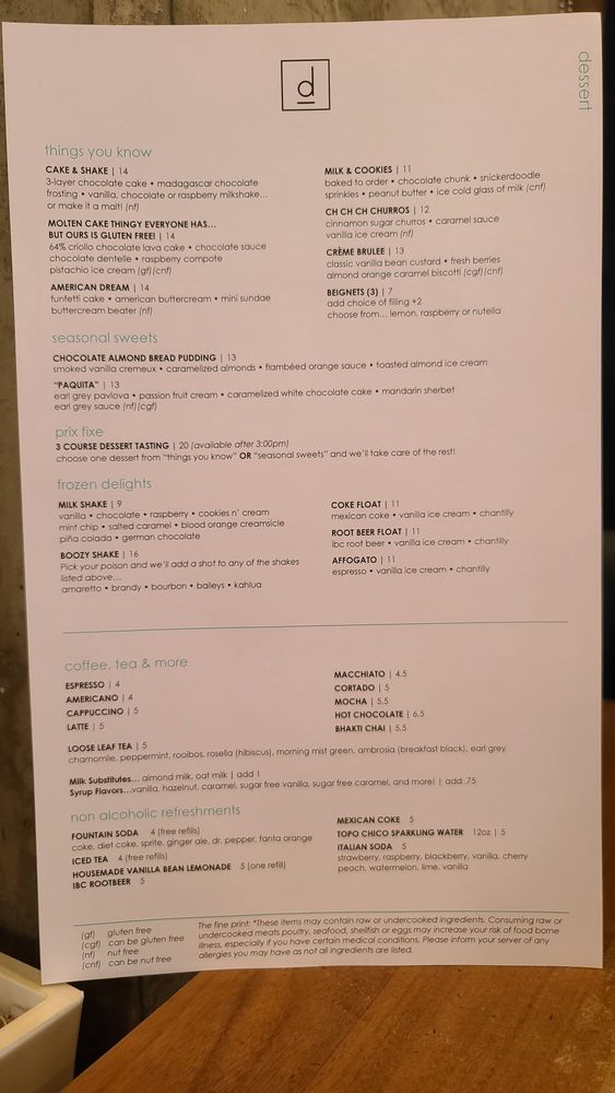 Introducing the menu at D Bar Denver, a trendy American restaurant renowned for its delightful desserts, breakfast, and brunch options. Located in Denver, CO, this establishment offers a range of amenities including reservation services, delivery options, vegan dishes, and wheelchair accessibility. Customers praise the exceptional service and delicious food, with rave reviews about the blackberry collins, smash burger, chicken quinoa bowl, and bacon wrapped dates. The ambiance is described as fun and the desserts are both delicious and aesthetically pleasing. Guests can enjoy happy hour specials, full bar, and even bring their furry friends along. With a variety of options for all tastes and dietary preferences, D Bar Denver is a must-visit destination for foodies looking for a memorable dining experience.